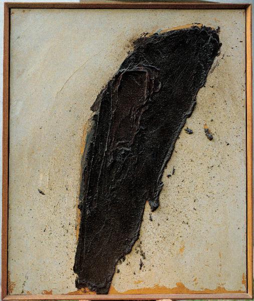 - NOTIZIE STORICO CRITICHE L'assenza di articolazioni nella figura del Cristo è il dato più rilevante di questa versione del crocefisso, dove la materia sembra colare informe e magmatica sul pannello. Eppure, un forma elementare emerge: l'ovale allungato e obliquo del corpo di Cristo sorge dalla base del dipinto con una forte tensione verticale, accentuata dal suo dilatarsi nella parte superiore, in corrispondenza con la curvatura delle spalle e in netto contrasto con il rovesciarsi all'ingiù del capo. Non si può del resto escludere che l'assottigliarsi del corpo nella parte inferiore possa alludere ad una sorta di scorcio prospettico, come se la figura fosse vista dall'alto (in analogia con il celebre Crocefisso di San Giovanni della Croce). Gli appunti dell'artista sottolineano il nesso tematico e simbolico tra questo crocefisso e i corpi informi di persone e animali sulle strade dell'India visitata un anno prima.
