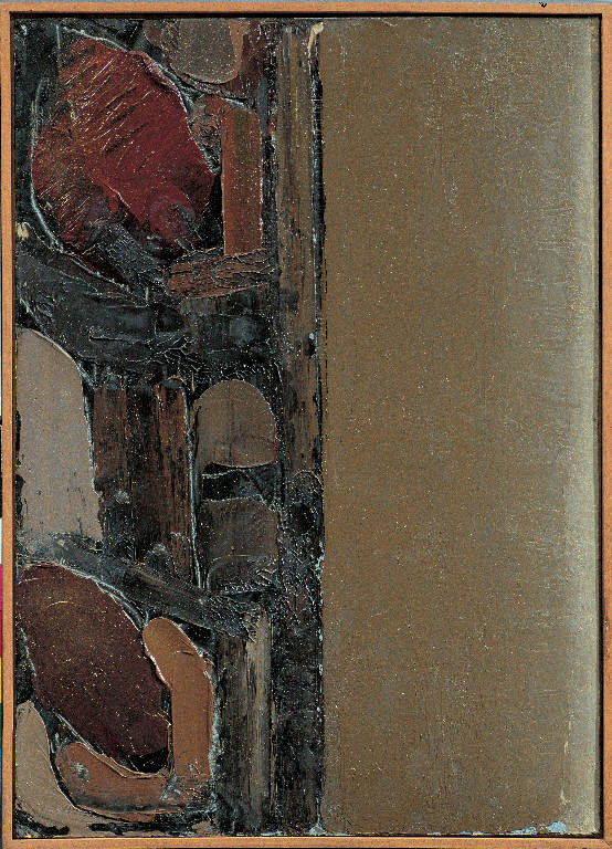 - NOTIZIE STORICO CRITICHE E' difficile ricostruire la vicenda creativa delle opere dedicate al fiume Gange vista la difficile identificazione di questo enigmatico soggetto. E' possibile, comunque, ricondurlo, grazie ad alcuni schizzi, ai forni crematori ("ghats") collocati lungo le rive del Gange. L'opera è risolta nella divisione del pannello in due fasce orizzontali: quella superiore, totalmente occupata dall'uniformità delle due spatolate, e quella inferiore giocata su incastri di indefinite pezzature circolari dai colori terrosi. In un secondo momento l'artista ha risolto di girare verticalmente il quadro.