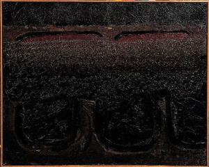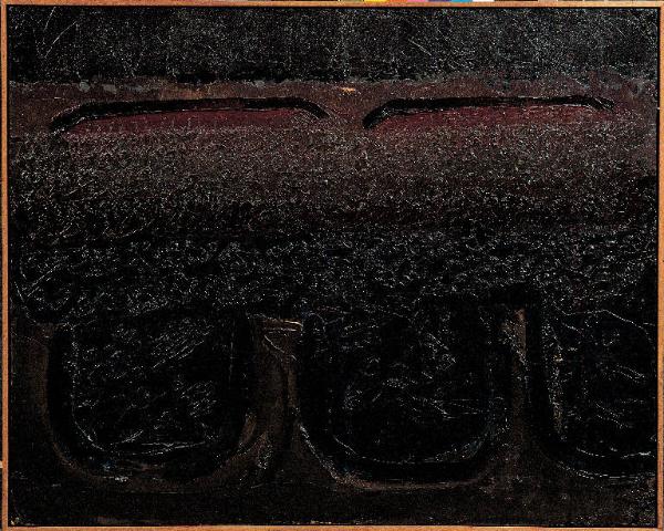 - NOTIZIE STORICO CRITICHE Tre grandi anse di colore neutro e bordate di nero si protendono, nella parte inferiore del dipinto, verso la zona mediana fittamente incisa, di un color bruno-rossiccio che si va schiarendo verso l'alto. Due strisce rosso scuro nella parte superiore, fanno da contrappunto ai segni analoghi della parte inferiore. Una banda color grigio cenere corona il bordo superiore. Segni pressoché astratti, che hanno però precisi valori denotativi e connotativi: i finestrini di carrozza ferroviaria in primissimo piano, dilatata proiezione dell'occhio dell'artista, separano lo spazio interno dal marciapiede della stazione gremito di folla. Quest'ultima, ridotta a un brulicare di graffiti, sembra sprofondare nelle orbite delle finestre e al contempo salire come marea montante, minacciando di sommergere le sagome rosso mattone delle carrozze visibili sullo sfondo. In effetti, nella parte mediana non c'è separazione tra i due spazi e la veduta può spaziare verso uno sfondo indeterminato.