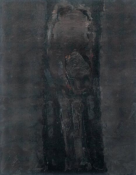 - NOTIZIE STORICO CRITICHE Come nel caso del "Sepolcro", anche qui il forte stravolgimento della figura del Crocefisso ha suggerito all'artista un mutamento di titolo. Su un fondo alquanto scuro, e inalveata in una banda verticale altrettanto scura, si staglia la figura verticale del Cristo privo di braccia, mentre sono visibili, nella parte inferiore, le gambe. Il capo, a sua volta, è scivolato al livello dell'addome, posizione inverosimile a meno di interpretare la figura come quella di un corpo ripiegato su se stesso (donde la nuova titolazione). La configurazione insolita dell'immagine, i toni molto scuri e la pittura alquanto rilevata, quasi da bassorilievo, sono altrettante anticipazioni del "Crocefisso, 165", eseguito un mese dopo.