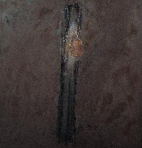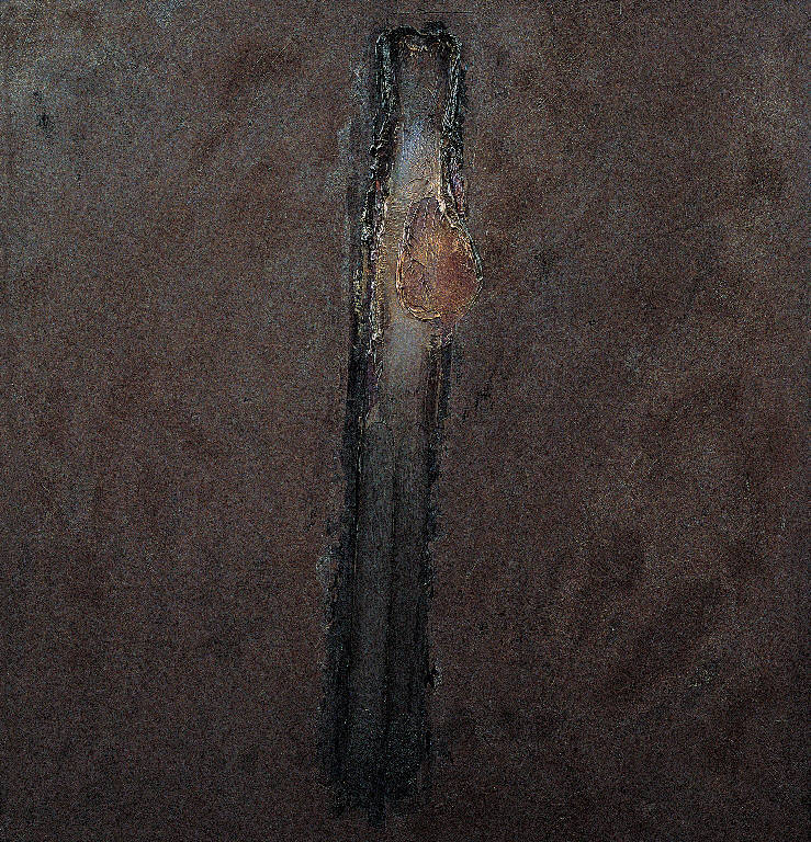 - NOTIZIE STORICO CRITICHE "Crocefisso, 165" testimonia della progressiva consumazione delle sembianze umane del Crocefisso perseguita da Congdon: «Dipingo "il corpo: testa-torace-gambe" come una sola massa scura di morte, ma interiormente luminosa, dell'alba della nuova vita. Le braccia spariscono [...], hanno la funzione descrittiva di definire la Croce, ma sono esterne all'intima sofferenza di Gesù; e così anche i piedi. Non elimino le gambe perché "homo erectus" senza le gambe non "sta"». In effetti, la figura del Crocefisso si riduce a una lunga e sottile barra verticale, proprio al centro del dipinto, totalmente isolata contro un fondo color bronzo, sul quale sembra essere sbalzata mediante un contorno che la assimila a una grande cicatrice: il corpo stesso, dunque, viene a identificarsi con la propria piaga. Tuttavia, la testa, abbassata sotto la linea delle spalle e quasi in procinto di staccarsi dal corpo, ha una forma accostabile a un seme e pertanto il corpo può essere associato a un solco.