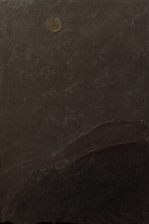 - NOTIZIE STORICO CRITICHE Nel persistere del tema iconografico sublacense l'artista dimostra una maturazione pittorica; sintetizzato il linguaggio e depurato da un concitato ductus, Congdon opta per delle soluzioni orientate verso un maggior lirismo tonale, in bilico tra il sentimento di distacco e di serena accettazione rispetto al mondo esterno, rappresentato dal dialogo della valle con la luna. Operando una graduale eliminazione della plasticità degli elementi naturali, aprendo e dissolvendo le forme in pure suggestioni cromatiche alla ricerca di ritmi "musicali" che variano d'intensità a seconda dello spessore della materia, Congdon decide per soluzioni cromatiche che tendono sempre più al monocromo; infatti è chiaro il rimando ai quadri completamente neri di Ad Reinhardt. Forse preludio alla stagione della Bassa Milanese, anche quest'opera trova una loro collocazione all'interno del suo infaticabile itinerario pittorico solo se viene riportata ai contesti storico-culturali, umani e spirituali da cui è nata.