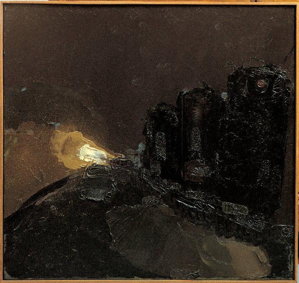 - NOTIZIE STORICO CRITICHE Anche questa seconda versione di Autostrada manifesta notevoli similitudini con la precedente serie dedicata ai "Treni". Anche se ritratta nell'oscurità della notte, e quindi giocata su blocchi di colore di nero e di marrone, che si intersecano e si sovrappongono, la scena si presenta alquanto naturalistica. "Dipingo la strada notturna, pioggia, camion davanti [...] i fari abbaglianti di chi ci viene avanti". Il timbro prescelto, quasi un'architettura di colori e incisioni, si caratterizza per un ardito modo di concepire lo spazio: aperto e dinamico, quasi d'azione, acquisisce una dimensione tridimensionale grazie alla resa prospettica affidata alla curva della strada e alle due automobili in sorpasso che, sorprese dal bagliore dei fari, sembrano barcollare nella carreggiata, lucida e scura come "la strada di Bombay".