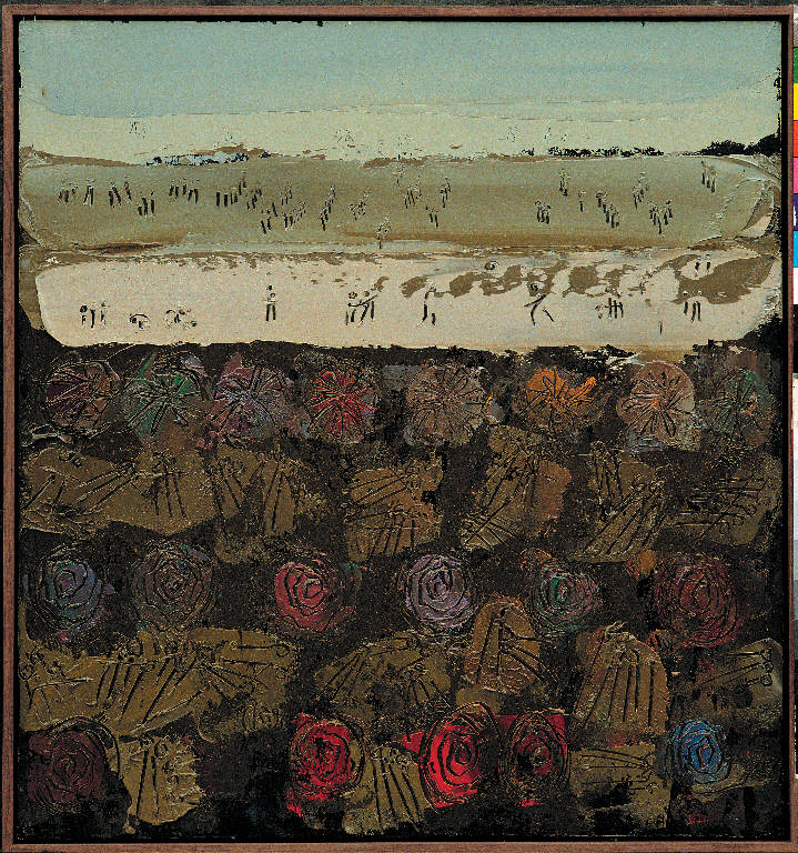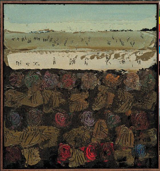 - NOTIZIE STORICO CRITICHE Sul paesaggio riminese Congdon ritorna nel 1981 con "Rimini, 1". La consueta veduta a volo d'uccello, che soprattutto nel primo piano appiattisce gli oggetti riducendoli a motivi ornamentali, consente all'occhio di sorprendere il disegno complessivo cui si piega, ignara, la folla di uno stabilimento balneare: in primo piano, la fioritura variopinta degli ombrelloni fa da contrappunto a "ciuffi" di bagnanti, mentre in secondo piano compaiono figure di bagnanti simili a caratteri o note di un rigo musicale tracciati nella sabbia; conclude il tutto, con un tono di luce chiarissima, la pastosa banda bianco-azzurrina del mare. Eppure non si può non cogliere una sorprendente analogia tra il tessuto floreale della parte inferiore di Rimini e il medesimo motivo, ma questa volta cinereo e luttuoso, di "Stazione Calcutta, 15" del 1975. E' un accostamento paradossale, quasi irriverente, che tuttavia lo stesso artista suggerisce in una nota di diario.