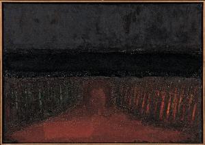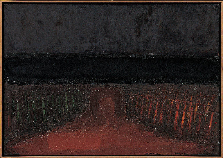 - NOTIZIE STORICO CRITICHE "Spiaggia notte Riccione", notevole per le tonalità cupe che esaltano la calda tinta rossastra della spiaggia in basso, presenta un motivo tipico del Congdon classico: la sequenza di ombrelloni chiusi a formare due quinte laterali attorno a una prospettiva centrale che richiama clamorosamente le piazze San Marco degli anni '50. L'opera, come le altre riccionesi dello stesso anno, fu dipinta nello studio di Gudo Gambaredo, con una significativa contaminazione tra mare e terra, frutto del gioco della memoria.