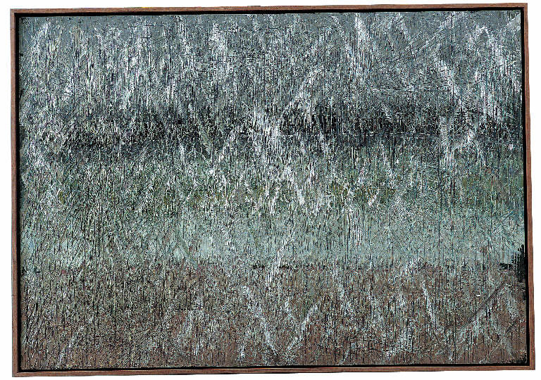 - NOTIZIE STORICO CRITICHE E' una delle vedute riccionesi eseguite nell'autunno, al ritorno nello studio di Gudo Gambaredo. In questo caso è notevole la sovrapposizione, a mo' di filtro, di una sorta di griglia, o reticolo regolare - fatto di incisioni e di spatolate d'argento, «uno dei più rilevanti "effets de pluie" della pittura moderna» - alla sottostante struttura di bande orizzontali allusive del paesaggio secondo un procedimento che ricorda certe vedute di città del 1949. E' l'artista a suggerirlo nel diario: «La pioggia - la cancellatura delle cose - e diventa un rettata [sic] più ghiacciante (argento) e fitta che non quella della città morta - La rettata di odio cancella l'inferno qui... anche se l'oggetto cancellato è il mare di Riccione».