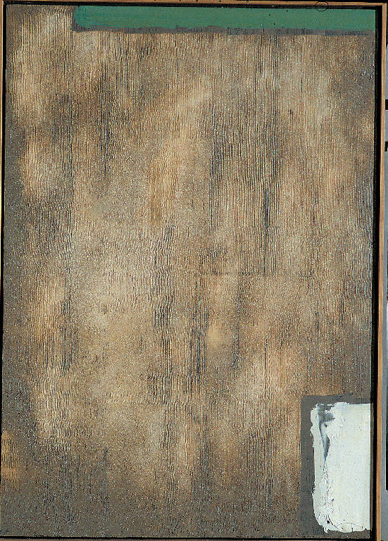 - NOTIZIE STORICO CRITICHE In "Verso primavera, 4 (brina rosa)" l'artista gioca sia sulla riduzione a pure note cromatiche del dato naturale, sia sulla sublimazione in pittura del bruto dato materiale - il terriccio impastato con il colore e delicatamente modulato con il pettine. L'impianto totalmente bidimensionale, l'estrema economia dei segni e la loro conformità agli assi ortogonali del quadro, fanno di quest'opera un ulteriore passo verso il riassorbimento della gestualità dell'Action painting. Vi corrisponde tuttavia una adesione se possibile ancor più intima all'oggetto naturale, la cui presenza - al di là o al di qua di ogni rappresentazione - è avvertibile in termini che fanno pensare quasi alla Land Art. Così sembra risultare nelle pagine del diario: «Pannello neutro pallido. Setaccio la polvere beige poi lento il pettine fine sempre su e giù. E' come un campo visto dall'aereo con delle ombre che emergono dal di sotto e delle ombre che cadono dal di sopra. ..."