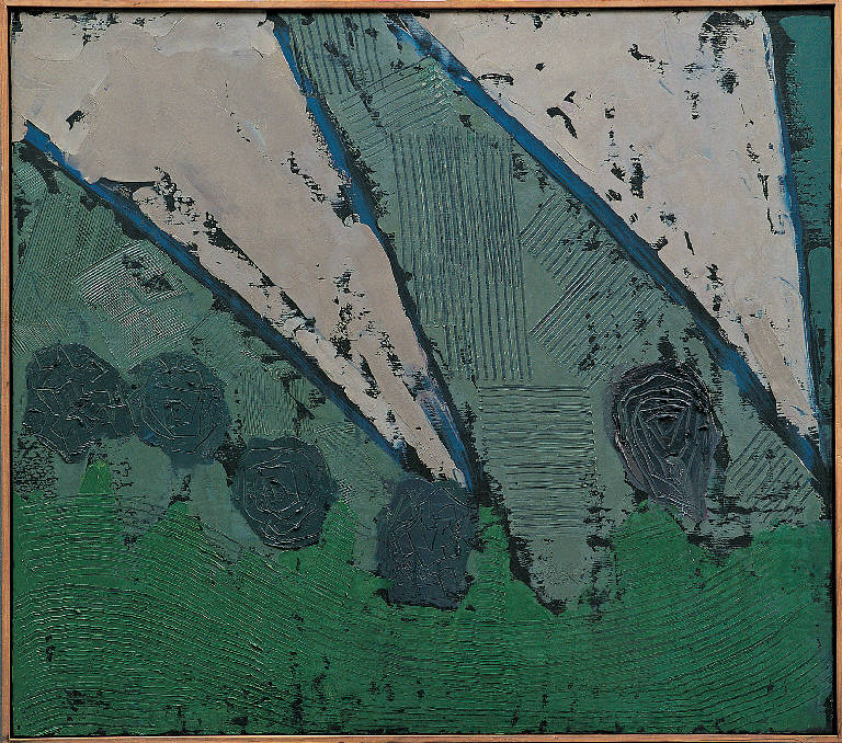 - NOTIZIE STORICO CRITICHE Dopo diversi mesi di stasi della pittura a olio - conseguenza di una operazione all'anca - Congdon ritorna al cavalletto nell'autunno dell''84. Come di consueto, la sua ricerca si sviluppa simultaneamente in diverse direzioni, che in buona misura sviluppano spunti già emersi nell'anno precedente. La serie "Cielo terra" del settembre, dai colori e dalle "textures" decisamente naturalistici, scardina tuttavia l'impianto orizzontale del landscape, con una soluzione che, in "Cielo Terra, 2" richiama "Estate, 15" del 1981: lungo assi obliqui, cielo e terra si compenetrano dinamicamente.