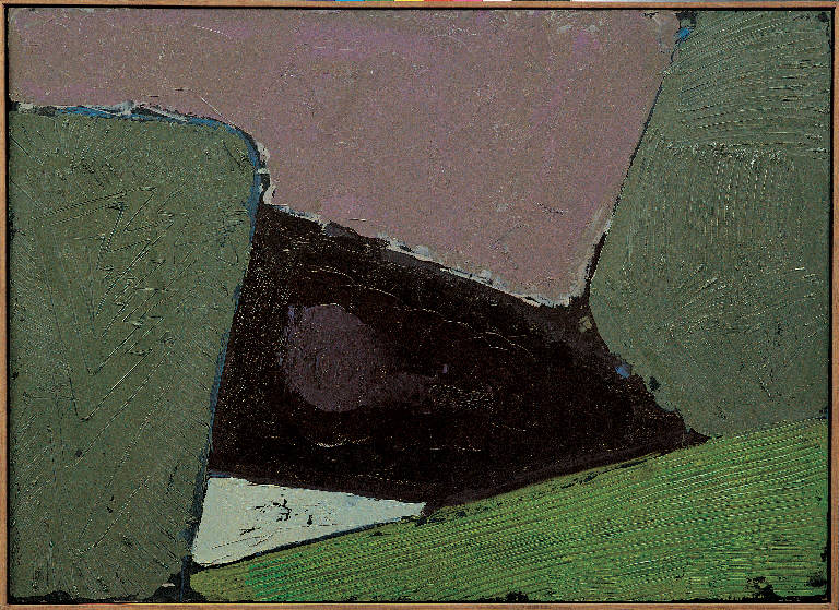 - NOTIZIE STORICO CRITICHE Il dipinto si colloca all'interno di un ciclo di pittura che va dal settembre al novembre del 1984, in cui cade la decisiva serie dei Cielo e terra, che mette a tema precisamente una nuova articolazione tra le due assise del paesaggio, con un definitivo superamento della veduta naturalistica e una progressiva compenetrazione tra cielo e terra, alto e basso. Quest'opera segna una tappa interessante in tale percorso: attorno a una campitura nera centrale (ma in cui si accende una macchia violacea e con cui fa contrasto una più piccola sezione di bianco), si dispongono altri quattro campi di colore, tre dei quali di altrettante tonalità differenti di verde e un quarto (evidentemente corrispondente al cielo) di un viola-grigio. Le linee di confine oblique e sfasate le une rispetto alle altre conferiscono un movimento rotatorio all'intera composizione, proprio a suggellare il congedo dagli abituali riferimenti spaziali.