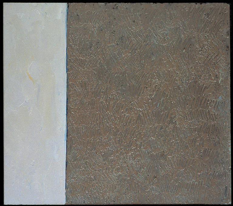 - NOTIZIE STORICO CRITICHE Dipinto nell'autunno, dopo un lungo periodo di stasi forzata della pittura ad olio, il quadro fa parte di una serie di opere sostanzialmente bicolori che accostano il cielo e la terra secondo uno schema verticale, invertendo la reale posizione dell'orizzonte. Il che probabilmente consegue da una nuova visione dei campi, già collaudata in anni precedenti, che corrisponde al desiderio di rovesciare un punto di vista divenuto troppo abituale e di sottolineare il valore unitivo, più che dividente, della linea d'orizzonte, nonché il carattere bidimensionale del dipinto. Cielo e terra si riducono così a due zone di colore affrontate: grigio metallico con riflessi giallastri per il cielo, marrone per la terra. Il gioco delle incisioni anima la superficie della terra, con una probabile allusione ai campi di stoppie.