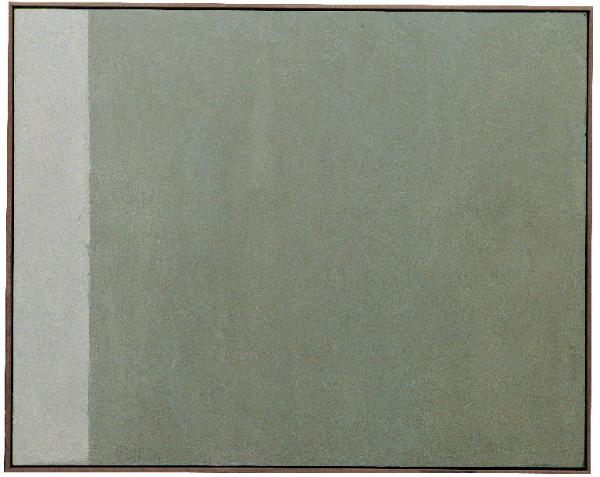 - NOTIZIE STORICO CRITICHE "Nebbia, 7", pur conservando le tenui tinte e le velature di colore dei "Nebbia" precedenti, torna alla netta separazione dei campi cromatici dei "Cielo e Terra"; e tuttavia al contrasto tra le due aree subentra una delicatissima armonia in grigio-verde.