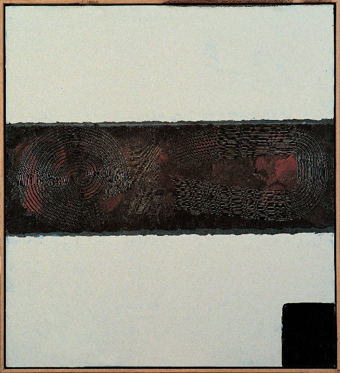 - NOTIZIE STORICO CRITICHE Un intento descrittivo-narrativo non è del tutto estraneo a La ferita, il cui titolo allude a un incidente sul lavoro occorso ad un amico dell'artista. Vi accenna Congdon stesso nel diario: «Rivedo ora tutto dal partire da questa sofferenza [...] pannello 100x110 tutto bianco con una (larga) traversata di nero che diventa sempre più sangue fino ad aggiungere delle incisioni larghe e circolari con dell'oro sopra». Per quanto ispirato ad un evento drammatico, il dipinto si inserisce pienamente nelle rigorose e composte geometrie di campi di questo periodo. Il dramma dell'esistenza non è assente, dunque, ma è tutto assorbito nella solennità delle aree cromatiche, rievocato emblematicamente da pochi ed elementari motivi grafici.