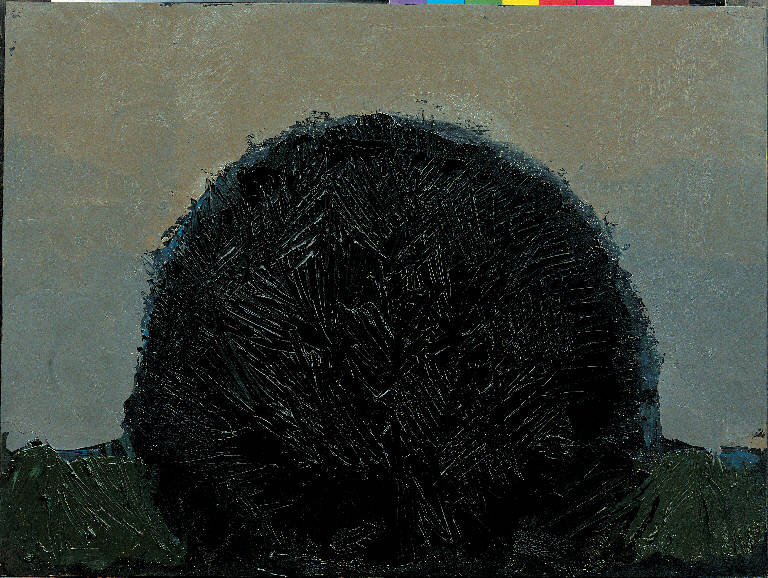 - NOTIZIE STORICO CRITICHE Dopo sette anni l'artista ritorna sul motivo inaugurale della sua stagione lombarda, il cespuglio di rovi sul quale affaccia la finestra dello studio.Tuttavia, l'esuberante naturalismo dei precedenti si compone in una struttura formale più rigorosa: la grande e compatta massa sferica del cespuglio, quasi nera e fittamente incisa al suo interno, si staglia in una sospensione quasi metafisica, contro un cielo che, in "Roveto 1", trascolora, con delicati passaggi, dal grigio all'ambra.
