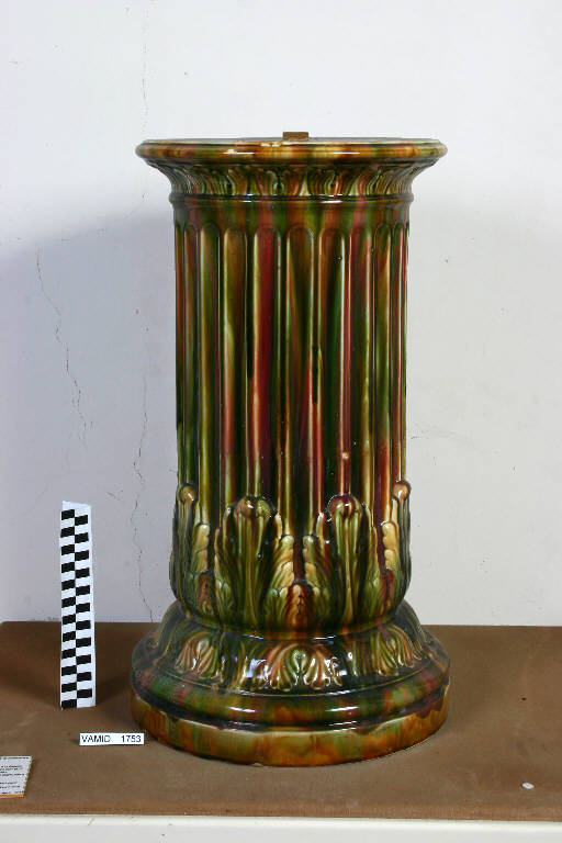 Piedistallo a colonna scanalata con base circolare fasciata di foglie di acanto. Decorazione a smalto di colore verde cupo, terra di Siena e rosso.