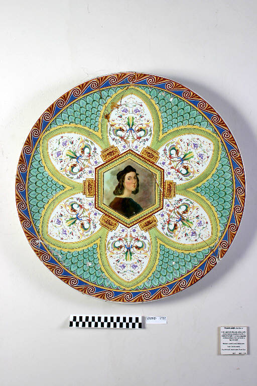 Ritratto di Raffaello entro campitura esagonale posta al centro di un grande fiore stilizzato a sei petali. Ogni petalo è decorato da motivi fitomorfi, mentre il fondo è composto da un motivo a scaglie verdi. L'orlo è decorato da un fregio a "cane corrente".