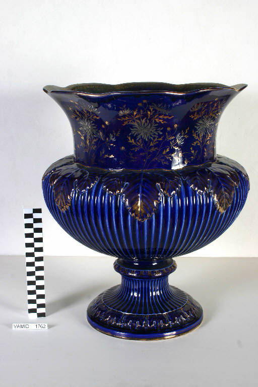 Vaso a forma di cratere privo di anse. Piede circolare con strozzatura, corpo segnato da coste rilevate e pampini a rilievo, collo liscio decorato con tralci fioriti (crisantemi stilizzati) dipinti in oro e platino, imboccatura ondulata. Cromia a smalto colore blu cobalto con lumeggiature in oro.