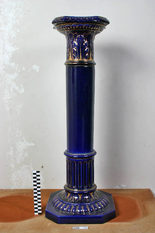 Piedistallo a colonna con base esagonale su cui si innesta elemento di raccordo circolare baccellato, capitello fasciato da grandi foglie di acanto. Cromia a smalto colore blu cobalto, spruzzato con lumeggiature in oro eseguite a terzo fuoco.