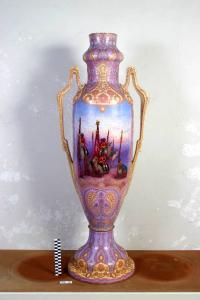 Grande vaso ad anfora con piede circolare bombato, corpo allungato, anse mistilinee e collo con doppia strozzatura; decorazione con motivi decorativi vegetali stilizzati rosa e gialli su fondo viola. Scene figurate realizzate soprasmalto e rifiniture in giallo eseguite a terzo fuoco.