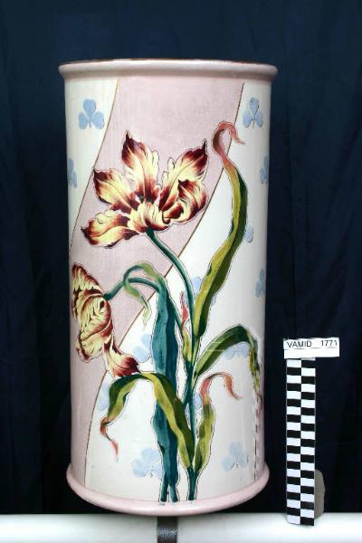 Portaombrelli cilidrico con bordi inferiore e superiore di colore rosa. Fondo a fasce ondulate verticali nei colori rosa e bianco alternati, separate da filetteture d'oro. Le fasce bianche sono arricchite da trifogli azzurri. Decoro principale a grandi tulipani e foglie. Tutti i fiori hanno contorni in oro.