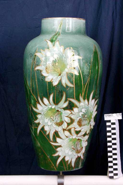Portaombrelli liscio, leggermente svasato verso l'alto, restringimento al collo. Decorazione dipinta a mano a grandi fiori bianchi e foglie su fondo verde smeraldo. Lumeggiature in oro brillante.