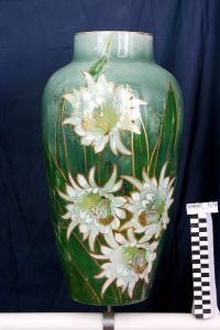 - NOTIZIE STORICO CRITICHE L'opera è realizzata a colaggio con decorazione a grandi fiori bianchi eseguita a mano sotto vernice sulla parte frontale. Le rifiniture in oro sono eseguite a terzo fuoco.