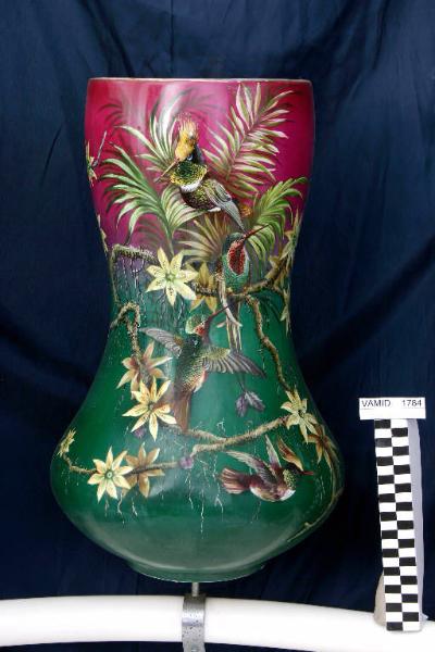 Portaombrelli piriforme, decorato sulla parte frontale con uccelli e rami fioriti. Fondo verde nella metà inferiore sfumato in bordeaux nella superiore.