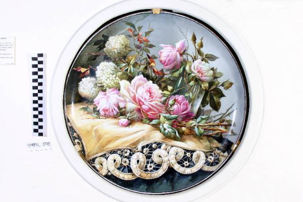 Grande piatto artistico con natura morta su fondo color grigio. Bordo rifinito in oro brillante e nero.