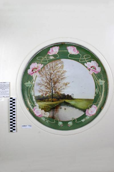 - NOTIZIE STORICO CRITICHE Il manufatto, che forma una coppia con il piatto gemello inv. 1794, è decorato a mano sopra vernice. Nel catalogo della Mostra del Liberty italiano il piatto è definito come appartenente "alla tipica produzione pseudo-popolare, in realtà borghese, della L. /Laveno/ nel secondo '800, con paesaggi standardizzati e scene di caccia (affini alle oleografie), aggiornati solo nei bordi decorati floreali". E ancora tali paesaggi sono definiti "di gusto volgare ottocentesco". I due paesaggi raffigurati nella coppia di piatti sono tratti da spolveri dello stesso autore. Sono quasi identici a due tempere su muro eseguite da Jacopini nel 1900 circa in una villa del Vercellese. L'oggetto è in deposito presso il Comune di Laveno-Mombello dal 1968.