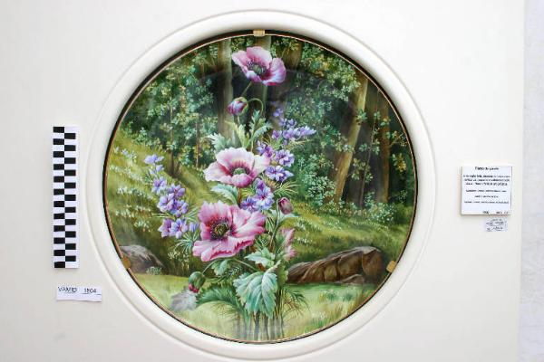 Grande piatto artistico con paesaggio boschivo e pianta di papaveri. Orlo rifinito in oro brillante.