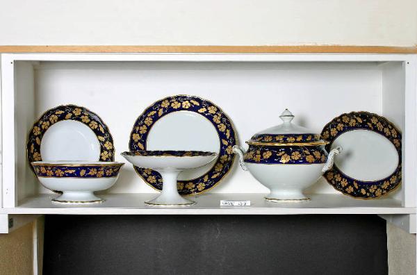 Il servizio da tavola è composto da quindici elementi: un'alzata, una coppa, un vassoio, una zuppiera e undici piatti.
