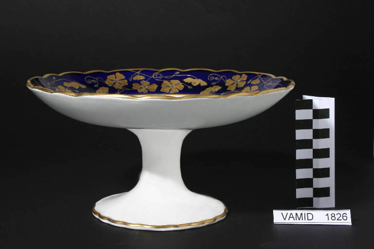 Alzata da tavola con bordo ondulato o festonato, decorato all'interno a fiori stilizzati in oro e argento su fondo blu. Rifinitura dell'orlo in oro brillante. Fondo, parte restrostante e piede in pasta bianca naturale.
