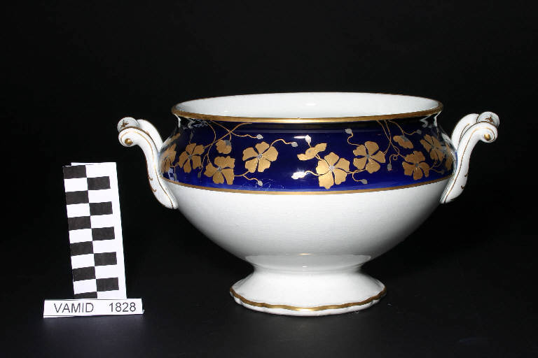 Zuppiera con manici "guarniti" e coperchio con pomolo romboidale. Imboccatura ondulata o festonata decorata a fiori stilizzati in oro e argento su fondo blu. Rifinitura dell'orlo in oro brillante. Interno e parte inferiore dell'esterno (compresi manici e piedino) in pasta bianca naturale con rifinitura in oro brillante.