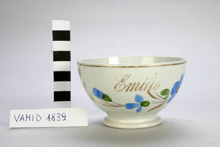 - NOTIZIE STORICO CRITICHE La ciotola da colazione è decorata a mano con ornali floreali policromi eseguiti sotto smalto, mentre le rifiniture in oro sono sopra smalto. Il Museo possiede diversi esemplari analoghi contrassegnati da nomi propri. L'attibuzione a Piero De Ambrosis è dubitativa: l'opera è stata segnalata alla mostra "Piero e Silvio De Ambrosis decoratori", allestita a Cerro nel 1992.\nOggetti di forma simile sono presenti nelle tavole dei decori con dicitura "Tazzina Milano" (Busta 95, fascicolo 2 Archivio SCI).
