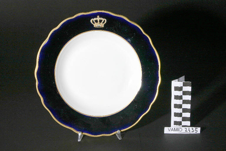 - NOTIZIE STORICO CRITICHE Il piatto fondo fa parte di un servizio già appartenuto agli Scotti Meregalli di Laveno e caratterizzato dalla corona del Regno d'Italia: il servizio è unico e non risulta prodotto in serie. Oltre agli esemplari in esposizione (inv. 2425-2438), sono conservati al museo altri otto piatti, una salsiera, una zuppiera, cinque porta uova e un piatto da portata.