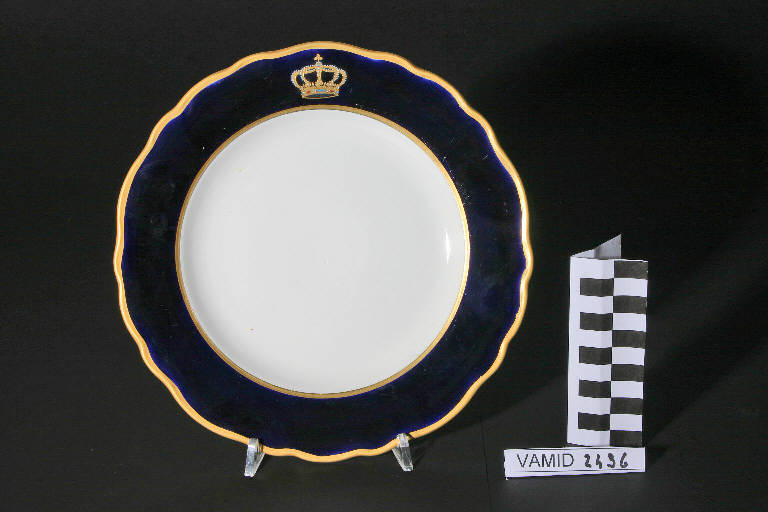 - NOTIZIE STORICO CRITICHE Il piatto piano fa parte di un servizio già appartenuto agli Scotti Meregalli di Laveno e caratterizzato dalla corona del Regno d'Italia: il servizio è unico e non risulta prodotto in serie. Oltre agli esemplari in esposizione (inv. 2425-2438), sono conservati al museo altri otto piatti, una salsiera, una zuppiera, cinque porta uova e un piatto da portata.