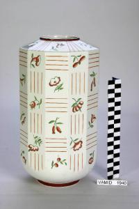 Vaso a sezione poligonale (a dodici lati) con fondo bianco e base e collo rifiniti in marrone; facce laterali decorate con motivi floreali e frutti disposti a scacchiera nei colori verde, marrone e rosso mattone.