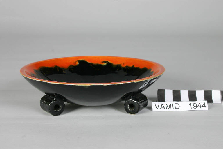 - NOTIZIE STORICO CRITICHE La coppetta, forse concepita come contenitore per dolci o posacenere, è stata acquistata presso un'asta Sotheby's. La stessa forma è riportata nel "Catalogo ceramiche artistiche 1939 A. XVII" della S. C. I. Laveno (tav. 8, n. 96) con dicitura "Coppa 1250/1" ma con decoro 2362. Il tipo fu disegnato da Guido Andlovitz che fu lo storico direttore artistico della Società Ceramica Italiana di Laveno dal 1923 al 1961: uno dei suoi carattere peculiare, oltre alla semplificazione della forma e del repertorio decorativo, è l'uso di una cromia netta e decisa, impostata prevalentemente sul rosso, l'arancio, il nero e il bianco.