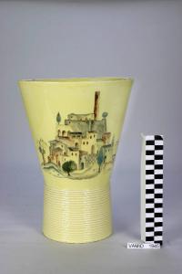 - NOTIZIE STORICO CRITICHE Il vaso, smaltato in giallo, fu realizzato con la tecnica al tornio foggiato e decorato a mano soprasmalto con la raffigurazione di un paese. La forma del vaso, realizzato nel 1930, venne presentata nel 1936 alla VI Triennale di Milano e fu riportata nel "Catalogo ceramiche artistiche 1939" della S. C. I. (tav. 2 n. 16 con dicitura "Vaso 1401 dec. 7251"). L'opera dovrebbe presentare il marchio di fabbrica Lavenia (Guido Andlovitz "La commedia ceramica"). Il tipo fu disegnato da Guido Andlovitz che fu lo storico direttore artistico della Società Ceramica Italiana di Laveno dal 1923 al 1961: suoi caratteri peculiari la semplificazione geometrica della forma e la freschezza del repertorio decorativo.