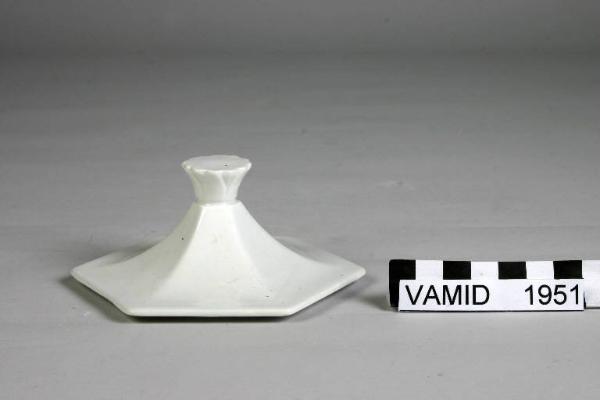 Vaso con piede circolare raccordato tramite strozzatura e gradino al corpo prismatico a sei facce rettangolari, coperchio piramidale con pomolo sommitale a forma di bocciolo stilizzato. Smalto bianco all'esterno e all'interno.