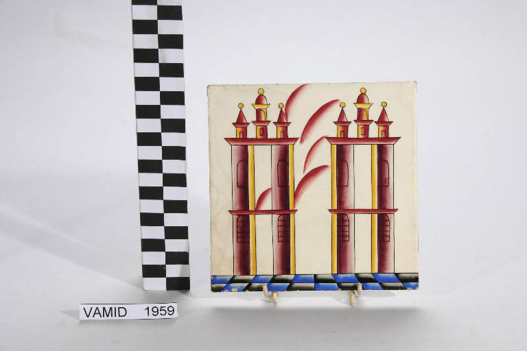 - NOTIZIE STORICO CRITICHE Questa piastrella di rivestimento è uno dei più tipici manufatti dell'Andlovitz per la sintetica e libera impostazione spaziale basata su scorci prospettici e sfumature che non suggeriscono profondità spaziali o volumetrie ma un personale e vigoroso senso decorativo.
