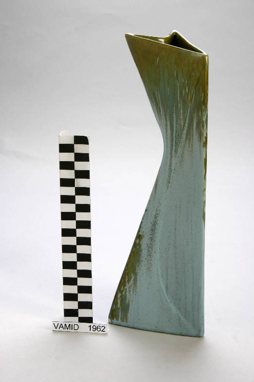 Vaso dalla sezione a coda di rondine, strozzato al collo a formare corpi triangolari; decorazione a smalto color verde acqua su cui è stato "colato" smalto color muschio.