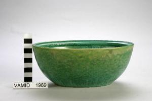 Scatola con coperchio. Smalto color verde screziato all'esterno, all'interno e in parte sul fondo.