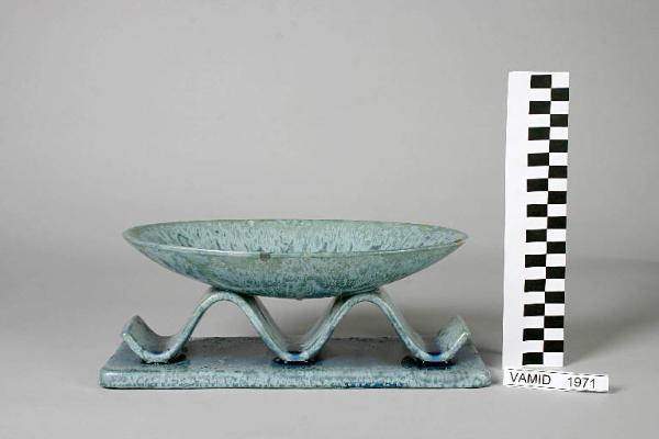 Centrotavola (o fruttiera) decorato a smalto color verde muschio. Base rettangolare su cui è fissato un supporto a onda sormontato da una coppa.