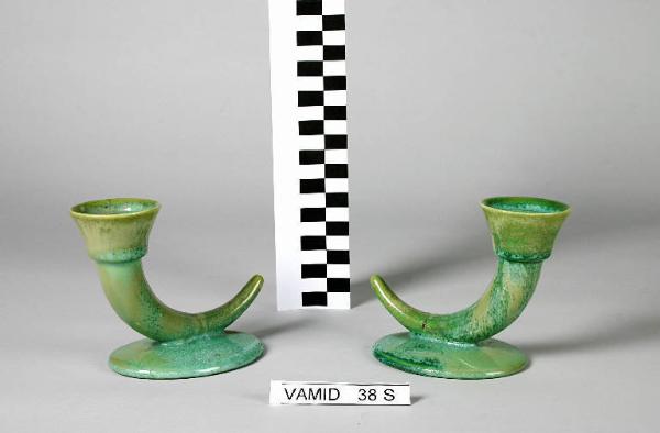 - NOTIZIE STORICO CRITICHE La forma delgli oggetti in esame è presente nel "Catalogo Ceramiche Artistiche" del 1939 della S.C.I. di Laveno (tav. 10 n. 121 con la dicitura "candeliere 2290" ma con smalto nero 30). Nel Museo sono conservati altri candelieri identici nei colori blu cobalto (num. inv. 477) e bianco avorio (nn. inv. 516, 3633).