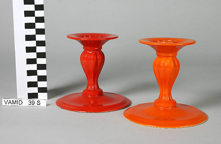 - NOTIZIE STORICO CRITICHE Il candeliere ha una forma presente nel "Catalogo Ceramiche Artistiche" del 1939 della S.C.I. di Laveno (n. 117 art. 12 con la dicitura "candeliere Monza 8" ma con smalto verde opaco 204). Di questa forma originale, prodotta per la Biennale di Monza intorno al 1930, esiste nel museo un altro esemplare di colore arancione.