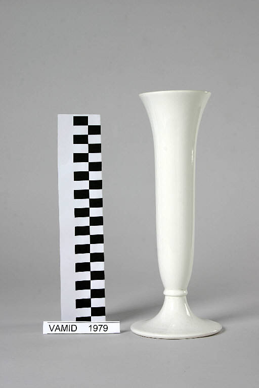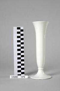 Vaso lungo e snello smaltato in bianco, senza alcuna decorazione. Piede circolare.