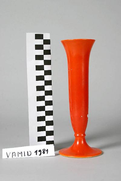 Vaso lungo e snello smaltato in rosso-arancione all'esterno e all'interno, senza alcuna decorazione. Piede circolare.