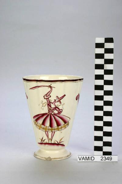 - NOTIZIE STORICO CRITICHE Il vasetto, eseguito a colaggio e in serie, è decorato a terzo fuoco soprasmalto in color porpora e oro zecchino. La forma è citata nel catalogo ceramiche artistiche 1939 della S. C. I. Laveno con la dicitura "Vaso Monza 9".