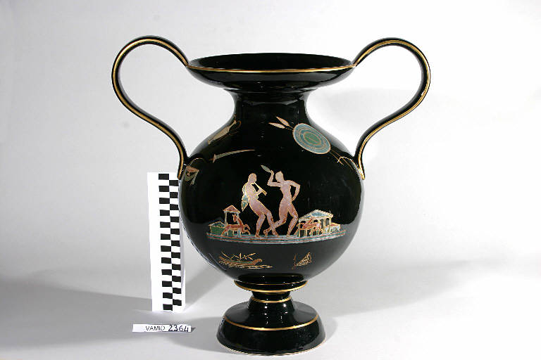 Vaso ad anfora smaltato in nero lucido e decorato in oro, bruno e verde con soggetti classici.
