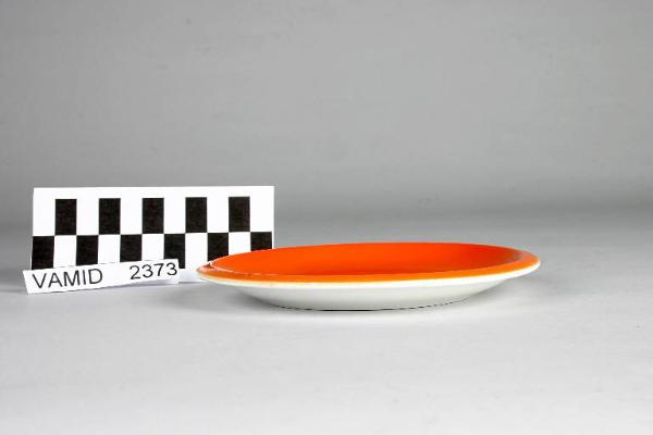 Piattino smaltato in rosso-arancione sulla faccia anteriore e lasciato nela colore bianco della pasta sul fondo.